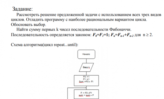 Задание: Рассмотреть решение предложенной задачи с использованием всех трех видов циклов. Отладить программу с наиболее рациональным вариантом цикла. Обосновать выбор. Найти сумму первых k чисел последовательности Фибоначчи. Последовательность определяется законом: F0=F1=1; Fn=Fn-1+Fn-2 для n 2.