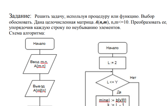Задание: Решить задачу, используя процедуру или функцию. Выбор обосновать. Дана целочисленная матрица A(n,m), n,m<=10. Преобразовать ее, упорядочив каждую строку по неубыванию элементов.