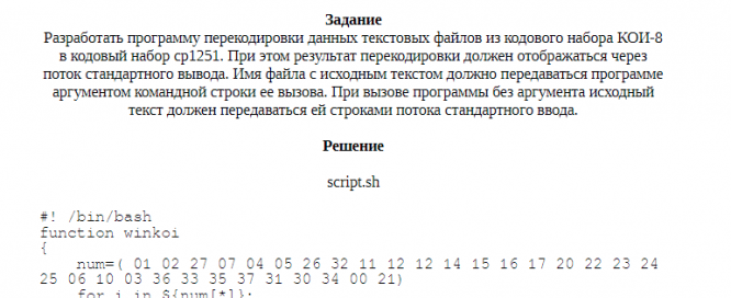 Разработать программу перекодировки данных текстовых файлов из кодового набора КОИ-8 в кодовый набор cp1251. При этом результат перекодировки должен отображаться через поток стандартного вывода. Имя файла с исходным текстом должно передаваться программе аргументом командной строки ее вызова. При вызове программы без аргумента исходный текст должен передаваться ей строками потока стандартного ввода.![]()