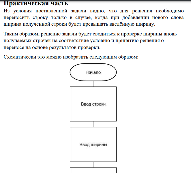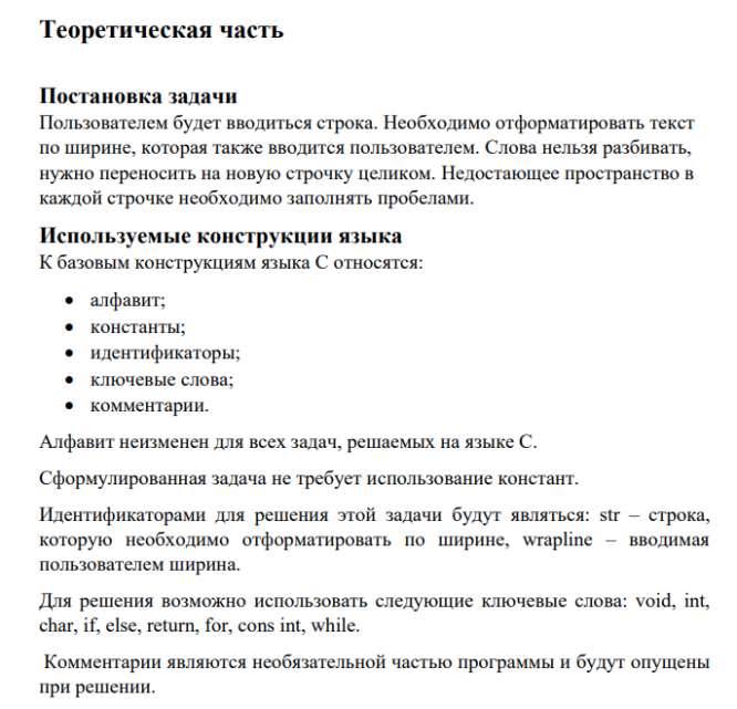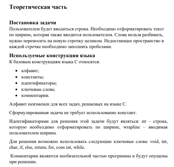 Постановка задачи Пользователем будет вводиться строка. Необходимо отформатировать текст по ширине, которая также вводится пользователем. Слова нельзя разбивать, нужно переносить на новую строчку целиком. Недостающее пространство в каждой строчке необходимо заполнять пробелами.