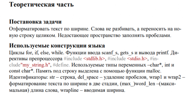 Отформатировать текст по ширине. Слова не разбивать, а переносить на новую строку целиком. Недостающее пространство заполнять пробелами. Используемые конструкции языка Циклы for, if, else, while. Функции ввода scanf_s, gets_s и вывода printf. Директивы препроцессора #include , #include , #include"my_string.h", #define. Используемые типы переменных –char*, int и const char*. Память под строку выделена с помощью функции malloc. Идентификаторы: str – строка, del_space – удаление пробелов, wrap1 и wrap2 – форматирование текста по ширине в две стадии, (max_)word_len –(максимальная) длина слова, wrapline – вводимая ширина.