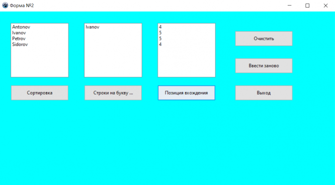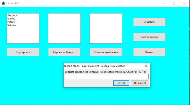 Lazarus 2 семестр ввод в MEMO вывод в ListBox, сортировка строк по алфавиту, нахождение позиции вхождения вводимого символа, нахождение строк на заданную букву. Строки вводить только из цифр и/или англ. Букв.