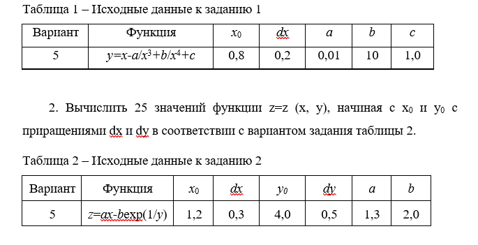 1. Вычислить пять значений функции , начиная с с приращением в соответствии с вариантом задания, представленным в таблице 1.2. Вычислить 25 значений функции , начиная с и с приращениями и в соответствии с вариантом задания таблицы 2