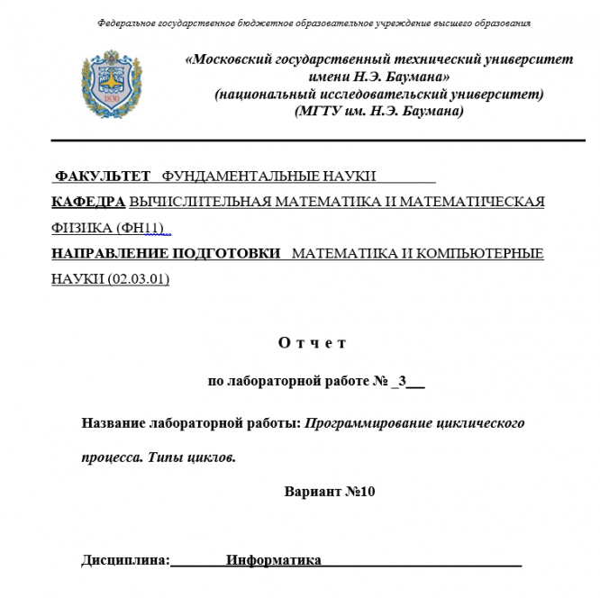 ФАКУЛЬТЕТ ФУНДАМЕНТАЛЬНЫЕНАУКИ КАФЕДРАВЫЧИСЛИТЕЛЬНАЯ МАТЕМАТИКА И МАТЕМАТИЧЕСКАЯФИЗИКА (ФН11)_ НАПРАВЛЕНИЕПОДГОТОВКИ МАТЕМАТИКА И КОМПЬЮТЕРНЫЕНАУКИ (02.03.01) Отчет полабораторнойработе№_3 Название лабораторной работы: Программирование циклическогопроцесса.Типыциклов. Вариант№10 Дисциплина: Информатика _ 1.10.2022__ (Подпись,дата) (И.О.Фамилия) ______________________ Т.Н.