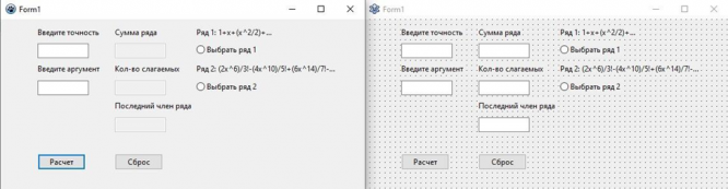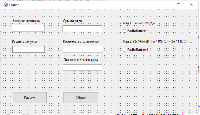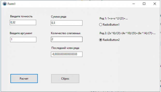 Задается аргумент ряда и точность. Программа должна выполнять расчет выбранного ряда (Ряд1 или Ряд2 выбирает пользователь). Выводятся значения суммы ряда, кол-во слагаемых и последний член ряда в соответствующие строки. При нажатии на кнопку Сброс все строки очищаются.