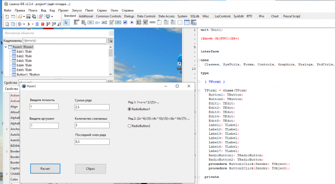 Лабораторная работа программа в Lazarus. В архиве также файл с объяснениями работы программы. Условие: Задается аргумент ряда и точность. Программа должна выполнять расчет выбранного ряда (Ряд1 или Ряд2 выбирает пользователь). Выводятся значения суммы ряда, кол-во слагаемых и последний член ряда в соответствующие строки. При нажатии на кнопку Сброс все строки очищаются. Ряд 1: 1+x+x^2/(2!)+... Ряд 2: (2x^6)/(3!)-(4x^10)/(5!)+(6x^14)/(7!)-... Вот так выглядит форма в сделанном виде: Программа при исполнении: Программа состоит из формы (TForm1) и нескольких компонентов (кнопки, поля ввода и вывода, метки, радиокнопки) с соответствующими событиями. Функция Factorial реализует вычисление факториала числа.