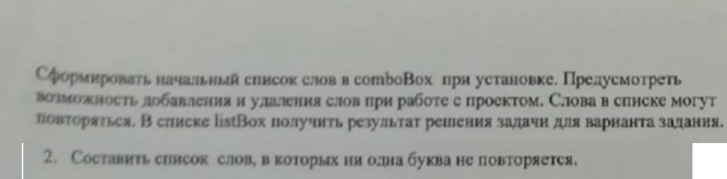 Сформировать начальный список слов в comboBox при установке. Предусмотреть возможность добавления и удаления слов при работе с проектом. Слова в списке могут повторяться. В списке listBox составить список слов, в которых ни одна буква не повторяется.