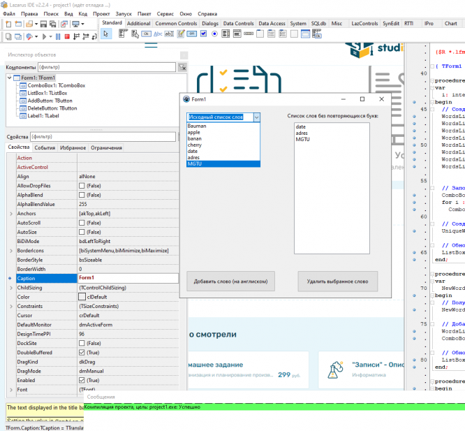 Лабораторная работа / задача из РК №2 программа в Lazarus. В архиве также файл с объяснениями работы программы. Условие: Сформировать начальный список слов в comboBox при установке. Предусмотреть возможность добавления и удаления слов при работе с проектом. Слова в списке могут повторяться. В списке listBox составить список слов, в которых ни одна буква не повторяется. Вот так выглядит форма в сделанном виде: .