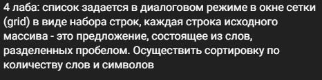 ЛР №4. Cписок задается в диалоговом режиме в окне сетки (grid) в виде набора строк, каждая строка исходного массива - это предложение, состоящее из слов, разделенных пробелом. Осуществить сортировку по количеству слов и символов.✅