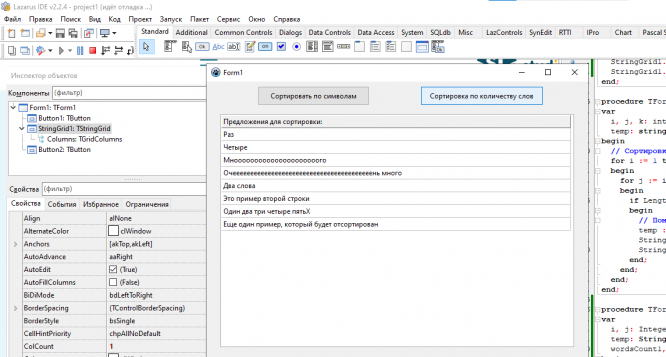 Лабораторная работа №4 / задача из РК №2 программа в Lazarus. В архиве также файл с объяснениями работы программы. Условие: Cписок задается в диалоговом режиме в окне сетки (grid) в виде набора строк, каждая строка исходного массива - это предложение, состоящее из слов, разделенных пробелом. Осуществить сортировку по количеству слов и символов. Вот так выглядит форма в сделанном виде: .