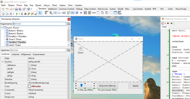 Лабораторная работа. Задание на графику и анимацию  / задача из РК  программа в Lazarus. В архиве также файл с объяснениями работы программы. Тэги: Программа на Lazarus, PascalObject, Pascal, Delphi, Turbo Delphi / Анимация, ЛР, РК, ДЗ, 2023 Условие: Задание на графику и анимацию. Разработать программу бабочка машет крыльями с регулированием скорости анимации. Программа создает графический интерфейс пользователя (GUI) с помощью формы (TForm) и различных компонентов, таких как кнопки (TButton), метки (TLabel), ползунок (TTrackBar) и элемент для рисования (TPaintBox). Также программа считает количество запусков. Программа создает графический интерфейс пользователя (GUI) с помощью формы (TForm) и различных компонентов, таких как кнопки (TButton), метки (TLabel), ползунок (TTrackBar) и элемент для рисования (TPaintBox).