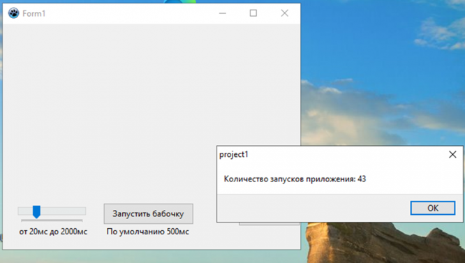 Программа создает графический интерфейс пользователя (GUI) с помощью формы (TForm) и различных компонентов, таких как кнопки (TButton), метки (TLabel), ползунок (TTrackBar) и элемент для рисования (TPaintBox). Также программа считает количество запусков.