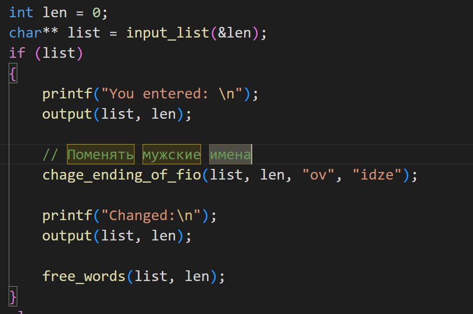 Язык С. Заменить окончания фамилий в массиве строк. Написать свои функции работы со строками Лаба по курсу информатики СМ 7 сдана Тассову К.Л. Условие: Написать свои функции для работы со строками strlen strchr strpbrk и другие Основная задача: Ввести с консоли массив строк Фамилия Имя Заменить окончания фамилий -ов на -идзе и -ова на -.... Тассов может придраться к коду, поэтому поймите как он работает и будьте готовы что-то переписать. // Проверка на пустую строку if (!str) return;.
