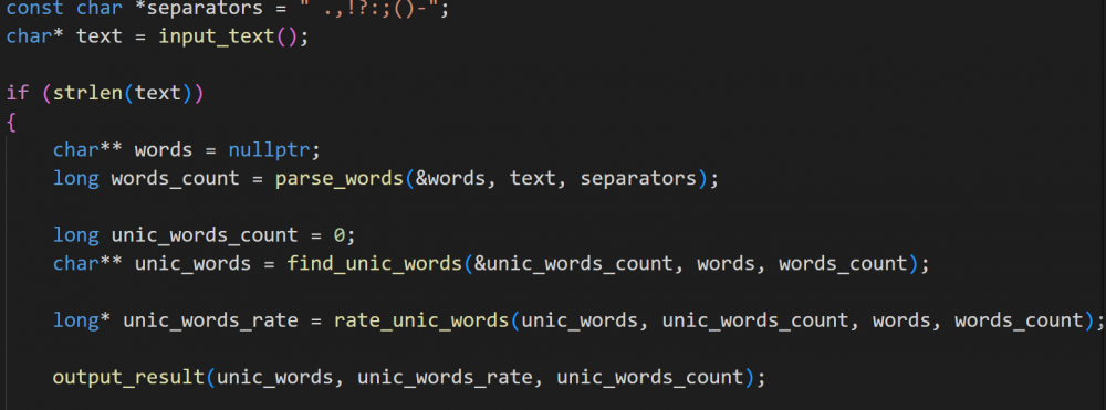 Язык С. Дан текст. узнать частоту встречаемости каждого слова, то есть сколько раз встречается каждое слово. Написать свой sting.h Лаба сдана Тассову К.Л. на СМ 7 Он может придраться к некоторым моментам, будьте готовы что-то поменять и разберитесь как работает код.
