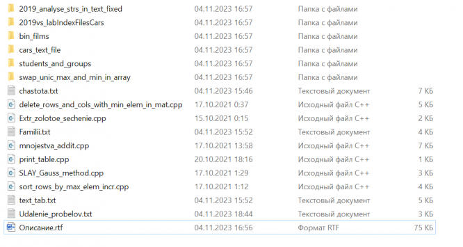 Mnojestva_addit На массивах реализовать множества Массив уникальных элементов - Добавление insert - Удаление remove - Принадлежность множеству belong Реализовать операции - Объедине - Пересечение - Вычитание Требования:  - КОНТРОЛЬ УНИКАЛЬНОСТИ ЭЛЕМЕНТОВ - Множество это массив уникальных элементов - Реализовать нужно все эти операции     SLAU_gauss_method  Решить СЛАУ методом Гаусса   Delete_rows_and_cols_with_min_elem_in_mat Удалить все строки и столбцы в матрице, содержащие минимальный элемент.   Sort_rows_by_max_elem_incr  Отсортировать строки матрицы по кол-ву максимальных элементов в них.    Swap_uniq_max_and_min Поменять местами  макс и мин элемент в массиве, если они уникальны   Print_table Распечатать в консоль таблицу квадратов от a до b   Extr_zolotoe_sech Написать программу, которая находит экстремум функции методом золотого сечения   Bin_films Работа  с бинарными файлами на примере каталога фильмов.