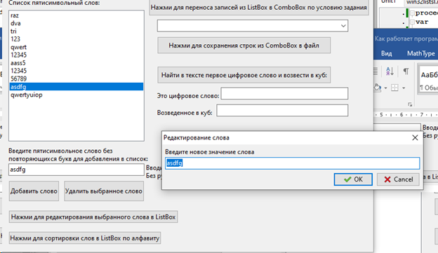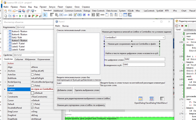 Лабораторная работа №3. Вариант 1. ЛР Задания на списки Можно попробовать переделать под свое условие Цель работы: Предусмотреть возможности: чтение из текстового файла, ввода, удаления и корректировки слов в исходном списке ListBox. Отсортировать по алфавиту. Решить задачу варианта, результат сохранить в списке ComboBox и выгрузить в текстовый файл. В архиве также файл с объяснениями работы программы. Тэги: Программа на Lazarus, PascalObject, Pascal, Delphi, Turbo Delphi, Pascal ABC / Анимация, ЛР, РК, ДЗ, 2023 Условия для программы, под которые она выполнена: 1. Сформировать список из пятисимвольных слов без повторяющихся букв. Найти в тексте первое цифровое слово и возвести его значение в куб.