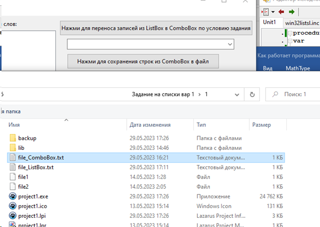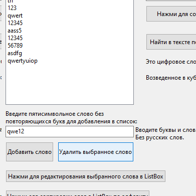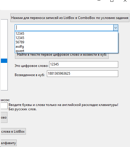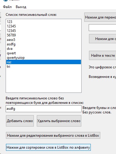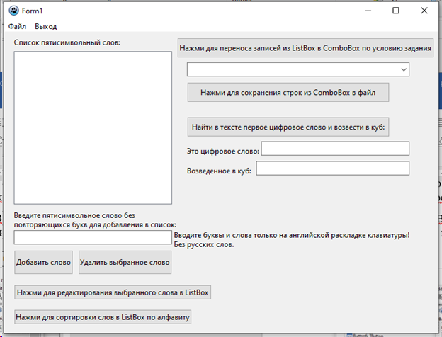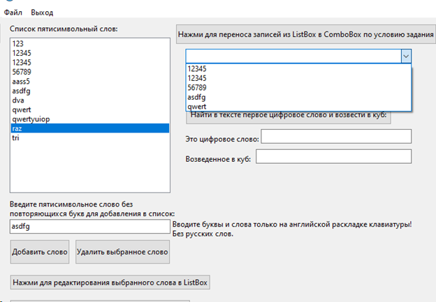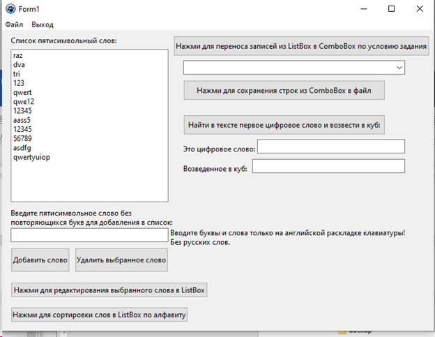 Цель работы: Предусмотреть возможности: чтение из текстового файла, ввода, удаления и корректировки слов в исходном списке ListBox. Отсортировать по алфавиту. Решить задачу варианта, результат сохранить в списке ComboBox и выгрузить в текстовый файл.