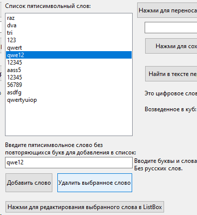 1. Сформировать список из пятисимвольных слов без повторяющихся букв. Найти в тексте первое цифровое слово и возвести его значение в куб.