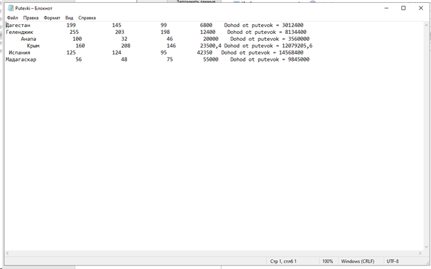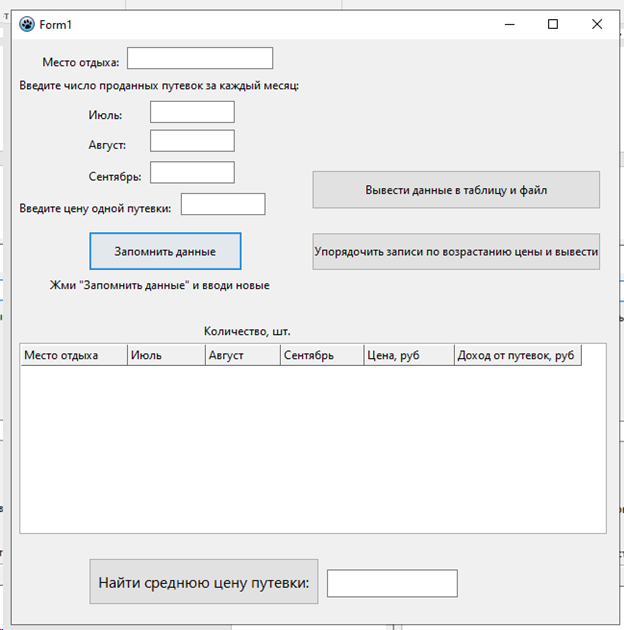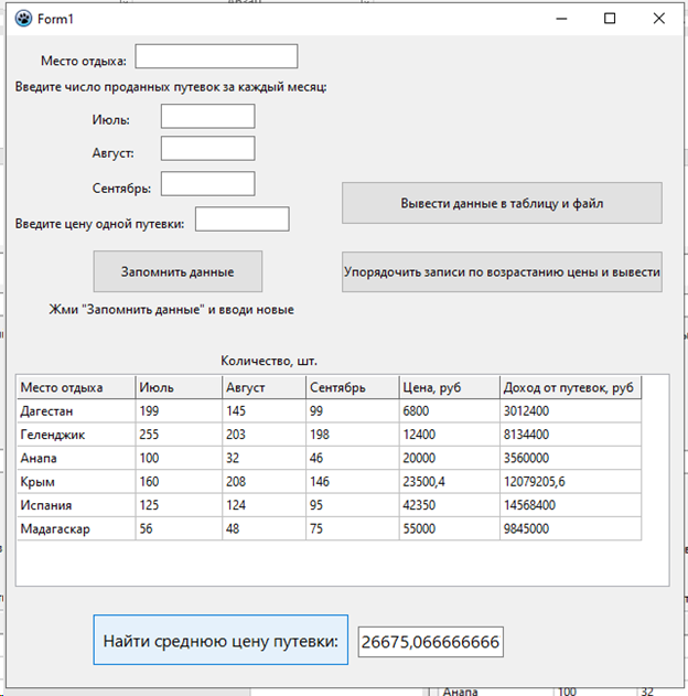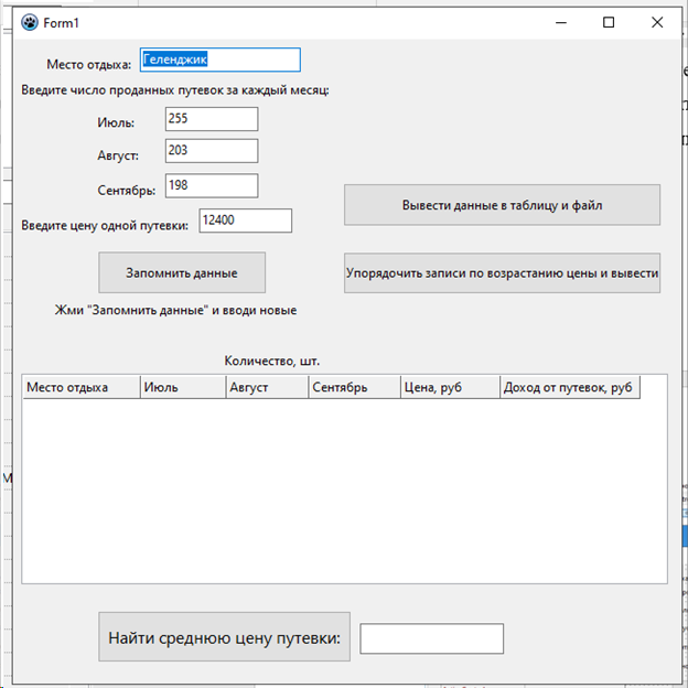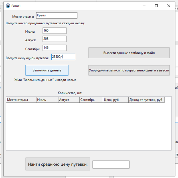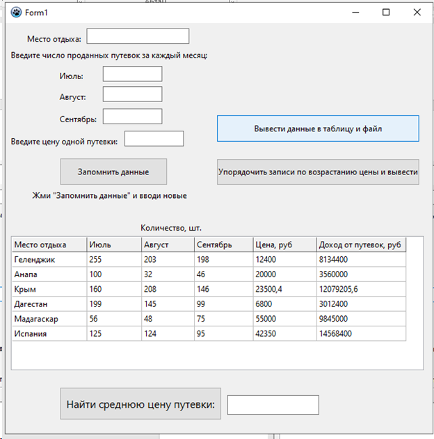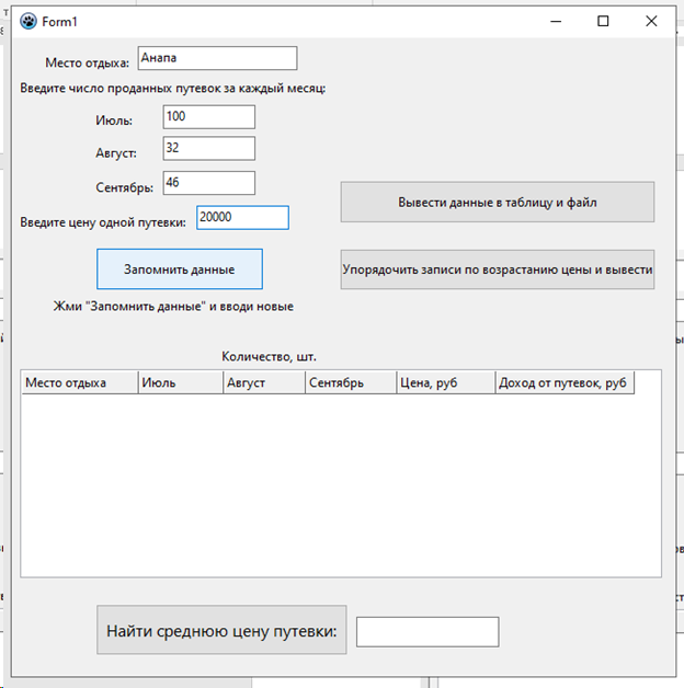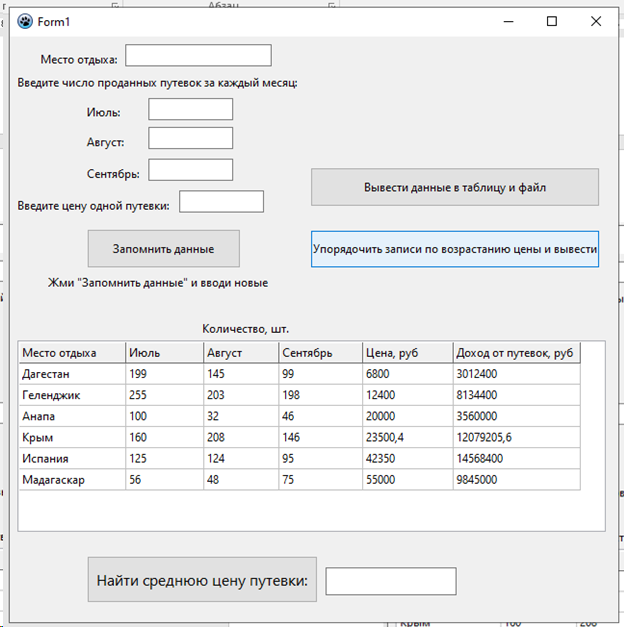 Работа со строками и записями - Создать структуру с данными по таблице 6. Добавить и вычислить в структуре поле «Доход от путёвок». Найти среднюю цену путёвки. Упорядочить записи по возрастанию цены.