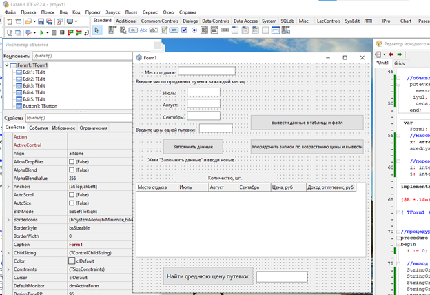 Button2Click ( Sender : TObject); varf : text file ; j : integer; s : string ; begin //количество строк в таблице StringGrid будет на 1 больше, //чем количество студентов (плюс 1 строка для шапки) StringGrid1.RowCount: = i +1; //вывод шапки таблицы StringGrid1.Cells [1 ,0]: = \'Фамилия\'; StringGrid1.Cells [2 ,0]: = \'Имя\' ; StringGrid1.Cells [3 ,0]: = \'Группа\'; StringGrid1.Cells [4 ,0]: = \'Город\'; StringGrid1.Cells [5 ,0]: = \' Улица\'; StringGrid1.Cells [6 ,0]: = \' Дом/кв.\'; StringGrid1.Cells [7 ,0]: = \'Средний балл\'; //вывод сведений о студентах в j-ю строку for j : = 1 to i do begin StringGrid1.Cells [1 ,j]: = x[j -1]. surname ; StringGridl.Cells [2 ,j]: = x[j -1].