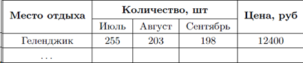 - Создать структуру с данными по таблице 6. Добавить и вычислить в структуре поле «Доход от путёвок». Найти среднюю цену путёвки. Упорядочить записи по возрастанию цены.
