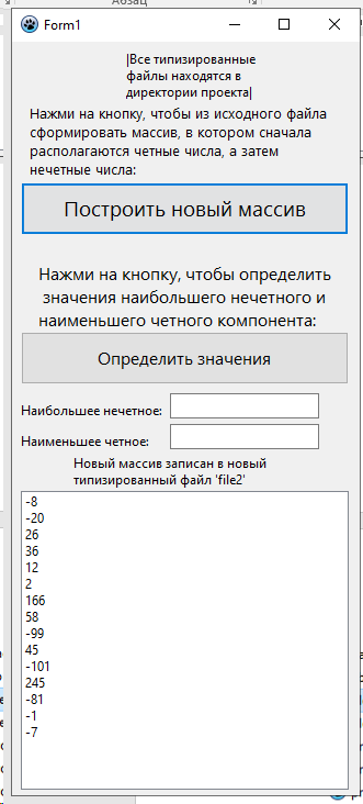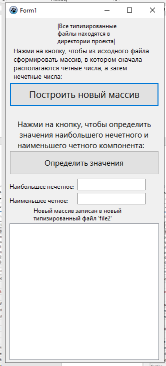 6) Создать типизированный файл, куда записать и целых чисел. Из файла целых чисел сформировать массив, записав в него только чётные компо- ненты, находящиеся до минимального элемента.