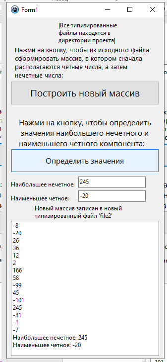1) Создать типизированный файл, куда записать и целых чисел. Из исходного файла сформировать массивы чётных и нечётных чисел. Определить наи- больший отрицательный и наименьший положительный компоненты фай-