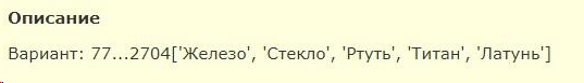 Вариант: 77...2704['Железо', 'Стекло', 'Ртуть’, 'Титан', 'Латунь']