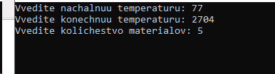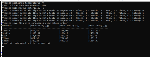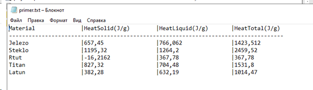 На выход: файл, отформатированный в виде таблицы. Со списком всей затраченной энергии для каждого материала и энергий, потраченных на каждое агрегатное состояние.