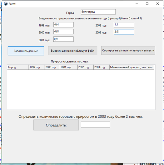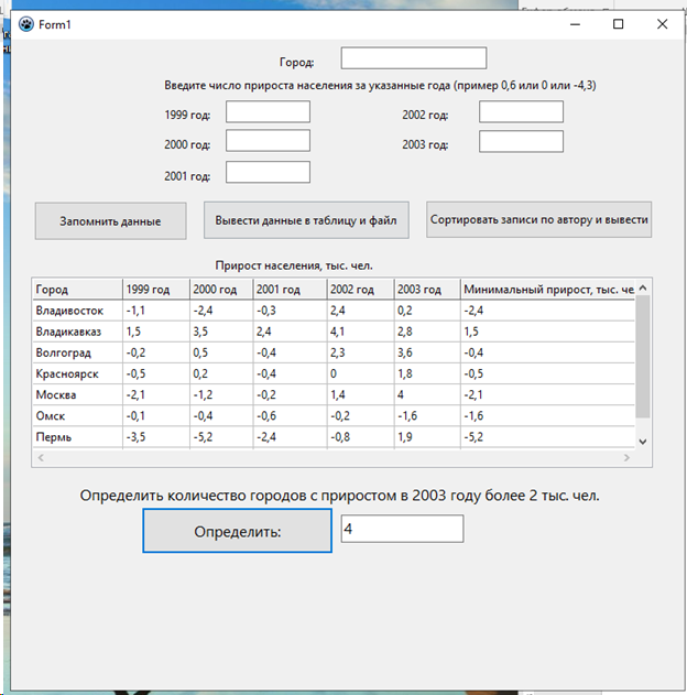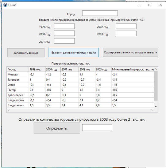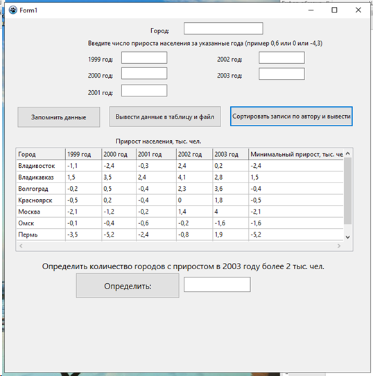 После щелчка по кнопке Вывести данные таблица заполняется введёнными сведениями (рис. 3). Рис. 2 Окно формы ввода сведений о студенте Рис. 3. Окно формы вывода сведений о студентах Рис. 4. Окно формы после сортировки записей по алфавиту фамилии После щелчка по кнопке Сортировать по алфавиту нужно повторно щелкнуть по кнопке Вывести данные, чтобы увидеть отсортированный список (рисунок 4). Задания Все таблицы должны содержать не менее десяти записей. 1) Создать структуру с данными по таблице 1: Таблица1. Прирост населения в городах Добавить и вычислить в структуре поле «Средний прирост». Определить количест....