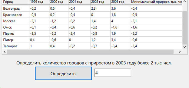 2) Создать структуру с данными по таблице 1. Добавить и вычислить в структуре поле «Минимальный прирост». Определить количество городов