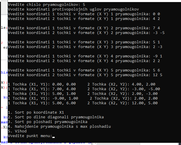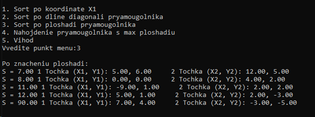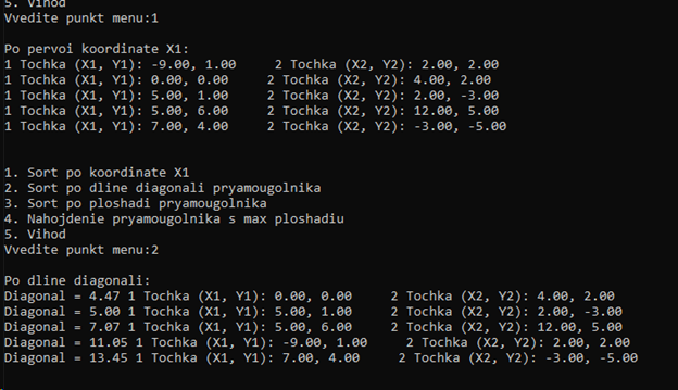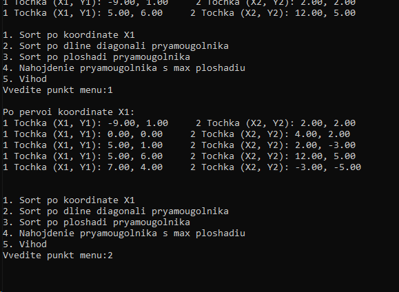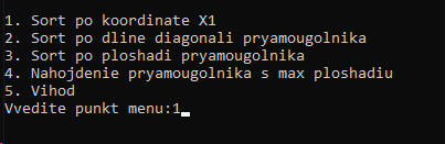 Главная » Учебные материалы » Информатика » Лабораторные работы » МГТУ им. Н.Э.Баумана » Несколько классов/семестров » Вариант 4 » Обработка массива записей - Прямоугольник: координаты 2 противоположных углов. Реализовать ввод одной записи по частям: если введенные данные корректны (напишите функцию проверки, см. задание 2) и в массиве записей не содержится дубликата, то добавит