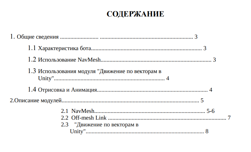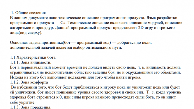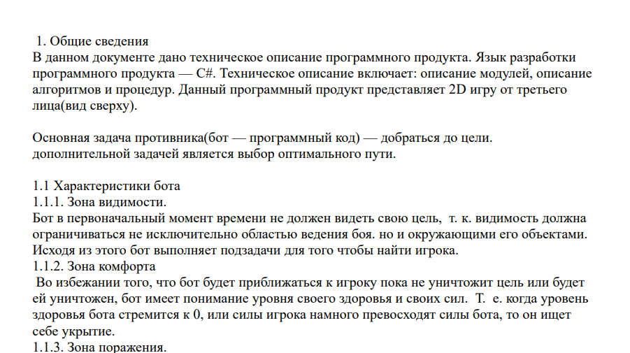 1. Общие сведения В данном документе дано техническое описание программного продукта. Язык разработки программного продукта — C#. Техническое описание включает: описание модулей, описание алгоритмов и процедур. Данный программный продукт представляет 2D игру от третьего лица(вид сверху). Основная задача противника(бот — программный код) — добраться до цели. дополнительной задачей является выбор оптимального пути. 1.1 Характеристики бота 1.1.1. Зона видимости. Бот в первоначальный момент времени не должен видеть свою цель, т. к. видимость должна ограничиваться не исключительно областью ведения боя. но и окружающими его объектами. Исходя из этого бот выполняет подзадачи для того чтобы найти игрока. 1.1.2. Зона комфорта Во избежании того, что бот будет приближаться к игроку пока не уничтожит цель или будет ей уничтожен, бот имеет понимание уровня своего здоровья и своих сил. Т. е. когда уровень здоровья бота стремится к 0, или силы игрока намного превосходят силы бота, то он ищет себе укрытие.