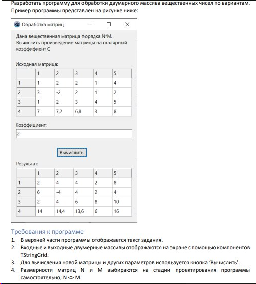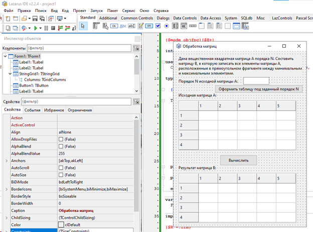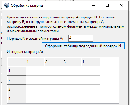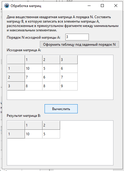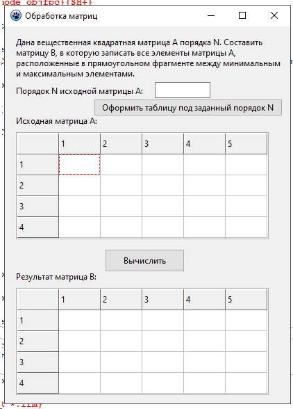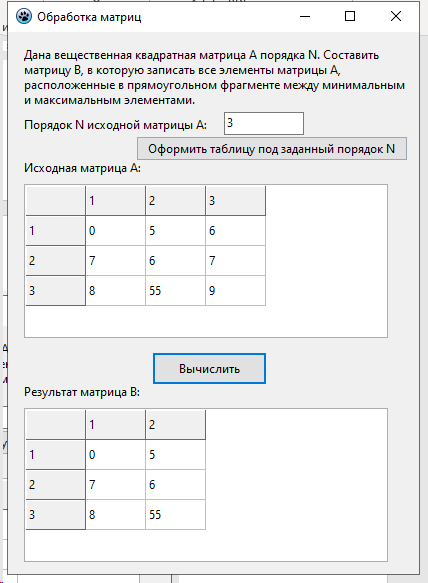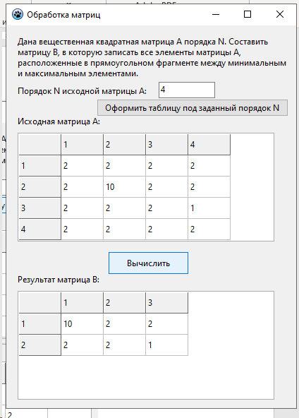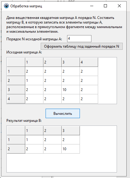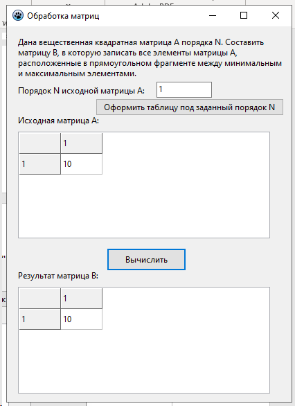 Лабораторная работа 4. Вариант 11. ЛР Обработка двумерных массивов - Обработка матриц Цель работы: Разработать программу для обработки двумерного массива вещественных чисел по вариантам. / задача из РК программа в Pascal Lazarus. В архиве также файл с объяснениями работы программы. Тэги: Программа на Lazarus, PascalObject, Pascal, Delphi, Turbo Delphi, Pascal ABC / Анимация, ЛР, РК, ДЗ, 2023 Условия для программы, под которые она выполнена: Дана вещественная квадратная матрица А порядка N. Составить матрицу В, в которую записать все элементы матрицы А, расположенные в прямоугольном фрагменте между минимальным и максимальным элементами. Скриншот из методы по лабе Программа в сделанном виде (которую покупаете): При нажатии на первую кнопку создается матрица с указанным порядком N, вы ее вручную заполняете, далее при нажатии на вторую кнопку создается вторая матрица-результат                 1.Компоненты формы: •Button1 и Button2: кнопки для выполнения операций.