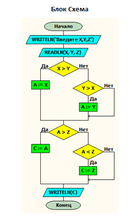 Переменной "С" присвоить значение переменной X, У или Z, имеющей максимальное значение.