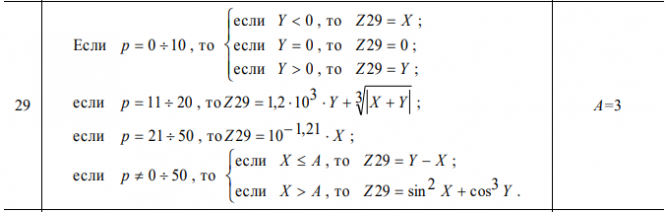 Пояснение. Исходные данные Х и Y следует подбирать так, чтобы убедиться в правильности выполнения программы, проведя расчеты по каждой из возможных ветвей. Для этого следует рассчитать искомую функцию сначала при комбинации исходных данных, соответствующих первой формуле задания, и полученный результат оценить по реальной формуле, например, с помощью обычного калькулятора. Затем аналогичным образом следует выполнить расчеты для второй, третьей и других формул задания. Для индикации используемой ветви можно организовать вывод порядкового номера формулы вычисления. Результаты всех вычислений следует представить в виде таблицы из трех значений X, Y и Z и соответствующего номера ветви функции. В каждом варианте вычисляемая функция состоит из семи ветвей, значит таблица результатов должна состоять из семи строк. В случае, если условия для какой-либо строки удовлетворить невозможно, напротив номера ветви в таблице можно написать комментарий «условие не выполнимо» Внимание: символ «÷» означает интервал! Например, выражение t = 02 означает, что целочисленная переменная t может принимать значения 0, 1 и 2.