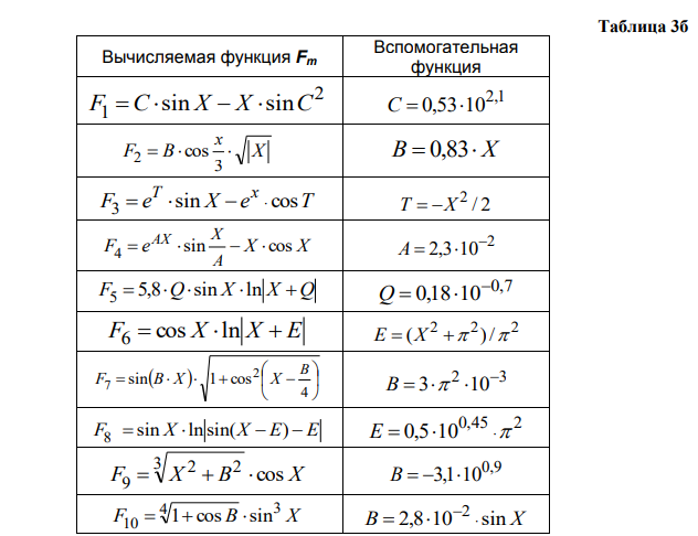 Составить циклическую программу вычисления функций Fm=F(X), где m=110, если аргумент Х изменяется от ХН до ХК с шагом Н. Вариант задания берется из табл. 3а в соответствии с номером, указанным преподавателем. Вычисляемая функция Fm вместе с вспомогательными функциями приведена в табл. 3б. Обозначения в графе “Задание на выполнение” табл. 3а следует расшифровать в соответствии с нижеследующими списками “Обозначения искомых переменных” и “Обозначения формируемых массивов”.