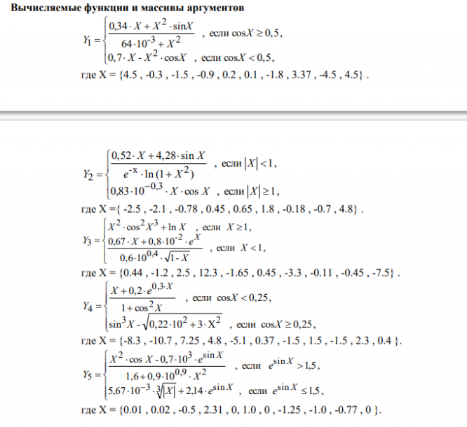 Составить циклическую программу вычисления функции Ym=F(Xi), где m=1-5, а аргумент Хi задан в виде массива. Вариант задания берется из табл. 4 в соответствии с номером, указанным преподавателем. Вычисляемые функции и массивы аргументов приведены посл