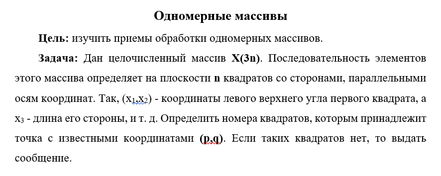лабораторная работа 4 иу6 мгту баумана 1 семестр 19 вариант Дан целочисленный массив Х(3n). Последовательность элементов этого массива определяет на плоскости n квадратов со сторонами, параллельными осям координат. Так, (х1,х2) - координаты левого верхнего угла первого квадрата, а х3 - длина его стороны, и т. д. Определить номера квадратов, которым принадлежит точка с известными координатами (p,q). Если таких квадратов нет, то выдать сообщение..