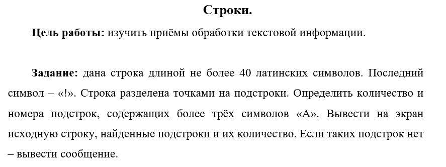 лабораторная работа 7 иу6 мгту баумана 1 семестр 19 вариант дана строка длиной не более 40 латинских символов. Последний символ – «!». Строка разделена точками на подстроки. Определить количество и номера подстрок, содержащих более трёх символов «А». Вывести на экран исходную строку, найденные подстроки и их количество. Если таких подстрок нет – вывести сообщение..