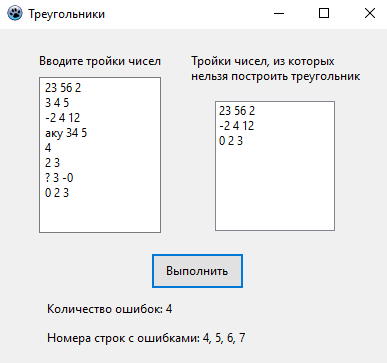 Лабораторная работа (рубежный контроль) по информатике за 2 модуль (преподаватель Волкова Л.Л.). Запись: треугольник (три стороны). Выписать в Listbox те записи, из которых не получаются треугольники (по результатам анализа трёх сторон). Пример работы программы ниже: в одну таблицу вручную вводятся тройки чисел, в другую выводятся тройки чисел, из которых нельзя построить треугольник. Также выводятся номера строк с ошибками и их количество (если помимо чисел вводились другие символы).