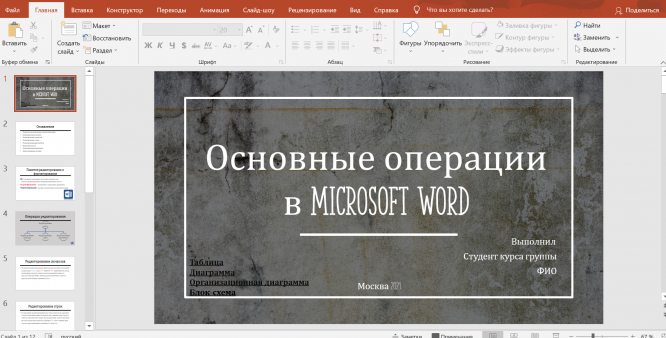 Презентация по информатике на тему "Основные операции в программе Microsoft Word". По мимо профессионального раскрытия темы работы, в презентации соблюдены следующие требования: