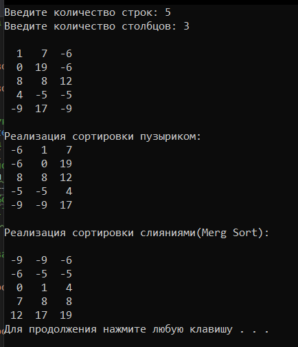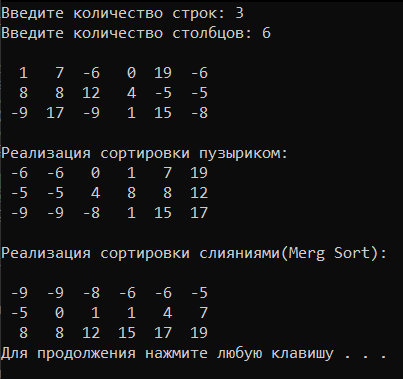 Написать программу, которая в двумерном массиве типа int размером N строк и M столбцов сначала сортирует каждую из строк пузырьковым методом(используя рекурсию), а затем выводит отсортированную последовательность всех элементов массива, используя принцип сортировки слиянием. Массив динамический, элементы инициализируются случайным образом.