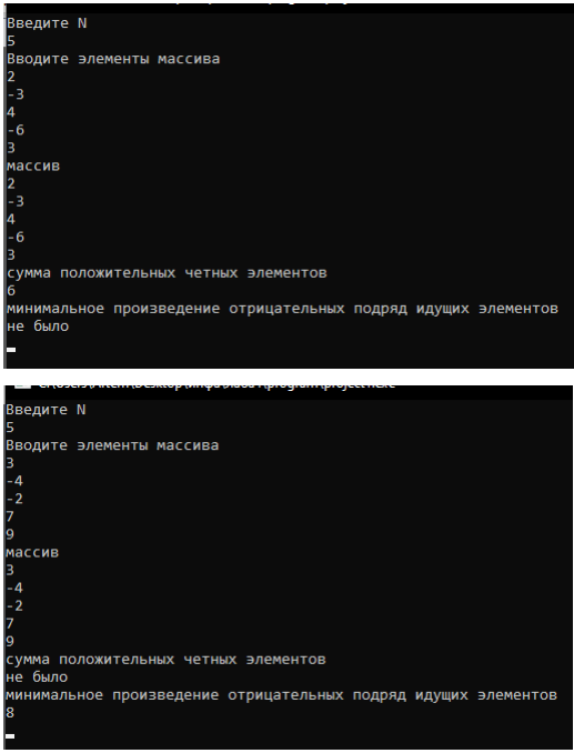 Pascal. В одномерном массиве, состоящем из N целых чисел, вычислить сумму положительных четных элементов и минимальное произведение отрицательных подряд идущих элементов.