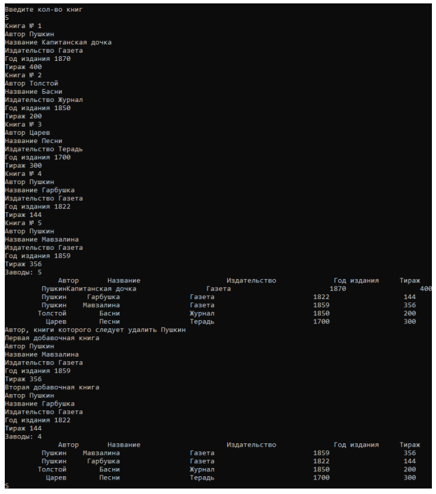 Pascal. Задан перечень книг в библиотеке: автор, название, издательство, год издания, тираж. Добавить в начало массива две книги, удалить все книги заданного автора.
