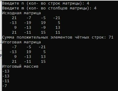Сформировать целочисленную матрицу M (m “меньше или равно” 8, n “меньше или равно” 10 ) с нечетными значениями, Находящимися в диапазоне от “минус” 21 до 21. Найти сумму положительных элементов четных строк. Просматривая матрицу по строкам, сформировать одномерный массив из первого отрицательного элемента каждой строки (Ф). В исходной матрице удалить элементы, расположенные на главной диагонали (П). Отсортировать одномерный массив в порядке возрастания значения элементов.