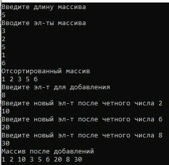 Pascal. Отсортировать все элементы динамического массива по возрастанию. Реализовать возможность добавления с клавиатуры Одного элемента в конец массива. Добавить после каждого чётного элемента массива число, введённое пользователем С клавиатуры.