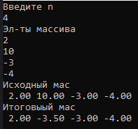 Pascal. Составить программу замены максимального элемента одномерного массива средним арифметическим отрицательных элементов. Если замена невозможна, то вывести сообщение об этом. Вывести одной строкой элементы исходного и преобразованного массива.