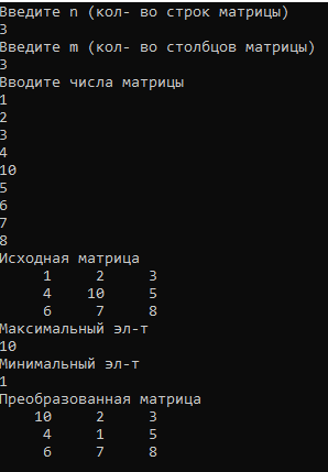 Дана целочисленная прямоугольная матрица А. Проверить, все ли элементы матрицы одинаковы? Если нет, переставить Максимальный и минимальный элементы матрицы. Исходную и преобразованную матрицу, а также максимальный и Минимальный элементы вывести в консольное окно. Если все элементы одинаковые, перестановку не делать и выдать Соответствующее сообщение.