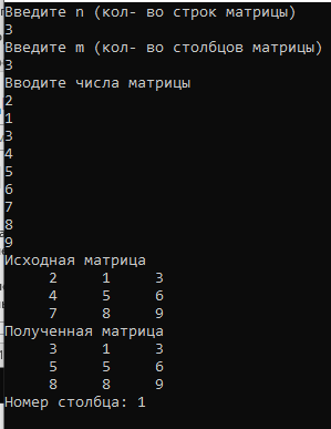 Дана целочисленная квадратная матрица A(n,n). Найти номер столбца, в котором расположен минимальный элемент главной диагонали матрицы. Все элементы этого столбца увеличить на его номер. Исходную и преобразованную матрицу вывести в окна списка. Номер найденного столбца вывести в текстовое поле. Для решения задачи составить подпрограммы: